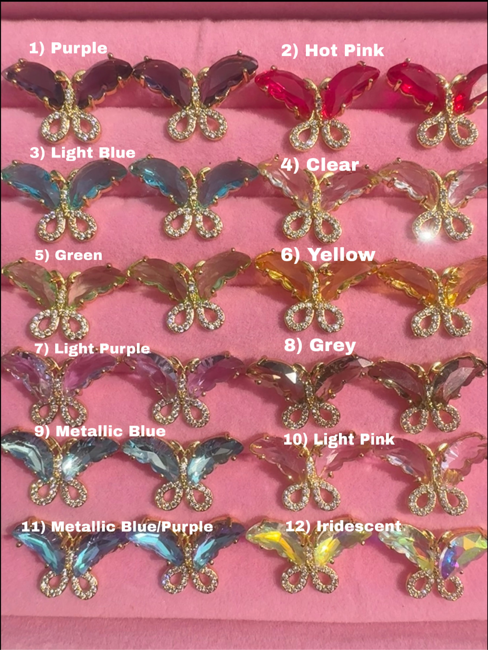 | Select Color | 1) Purple, 2) Hot Pink, 3) Light Blue, 4) Clear, 5) Green, 6) Yellow, 7) Light Purple, 8) Grey, 9) Metallic Blue, 10) Light Pink, 11) Metallic Blue/Purple, 12) Iridescent |