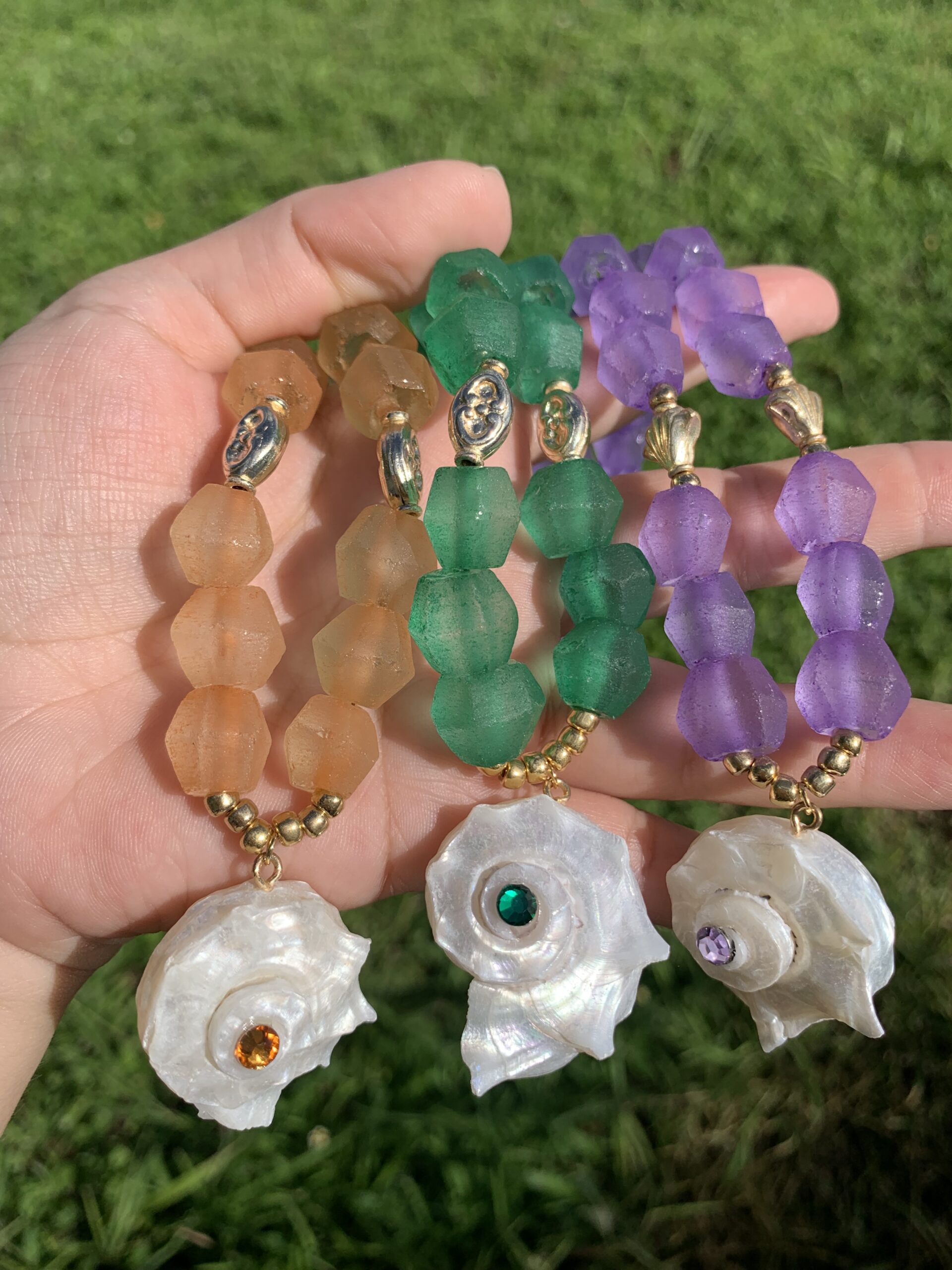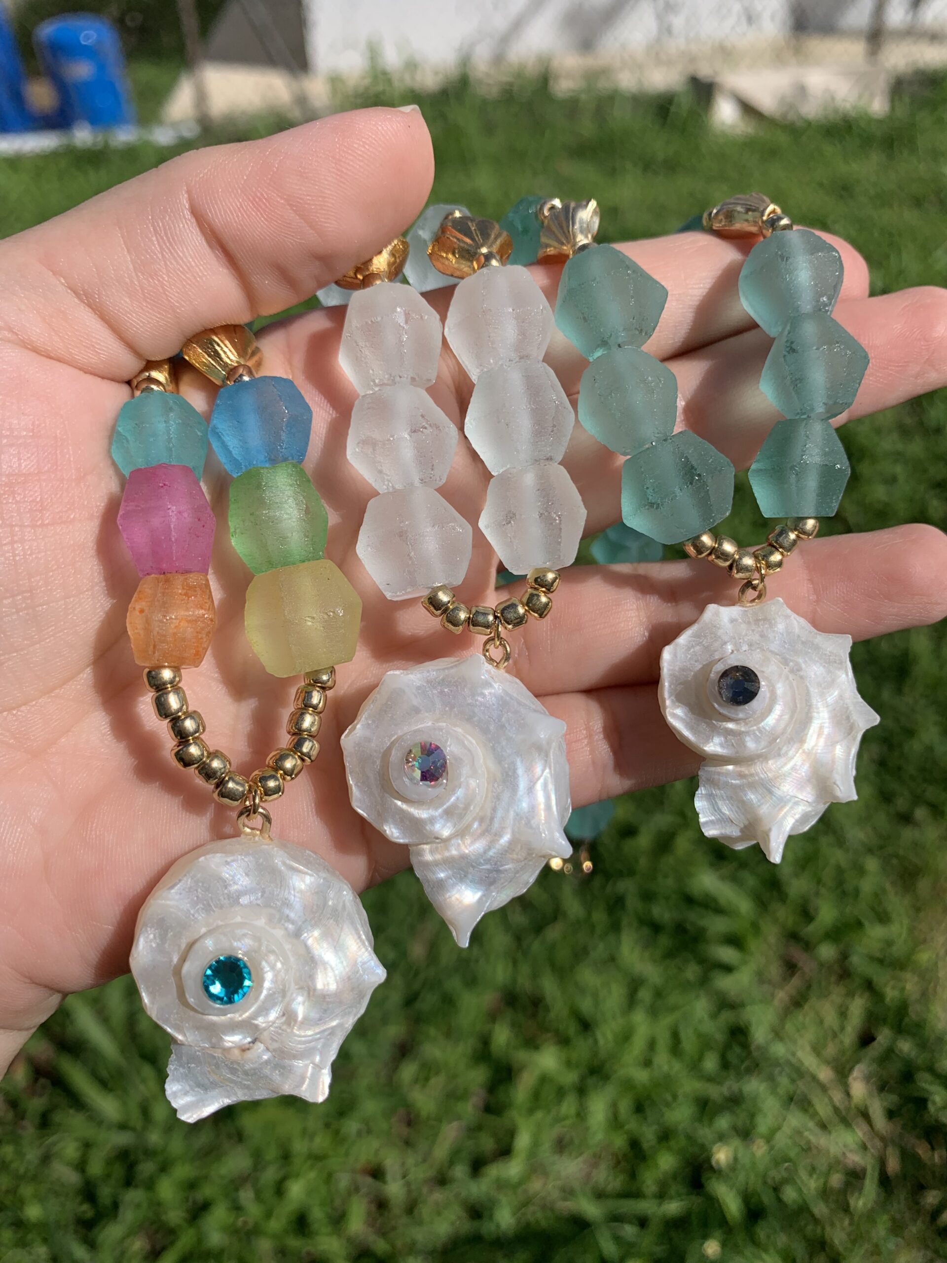 Glass beads, gold plated beads, shell, crystal and gold plated closure. Price is for 1 necklace. Precio es por 1 collar.